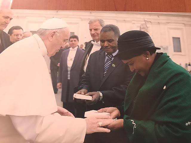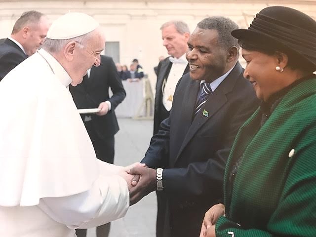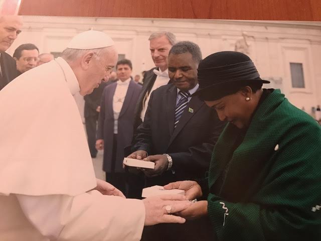 Balozi wa Tanzania nchini Ujerumani aliyemaliza muda wake, mheshimiwa Philip Sanka Marmo ambaye alikuwa anahudumia nchi 10 ikiwemo Vatican, akiagana na Baba Mtakatifu Papa Francis jana baada ya kustaafu utumishi wake, (kulia) ni mke wake mama Nuruana Marmo.