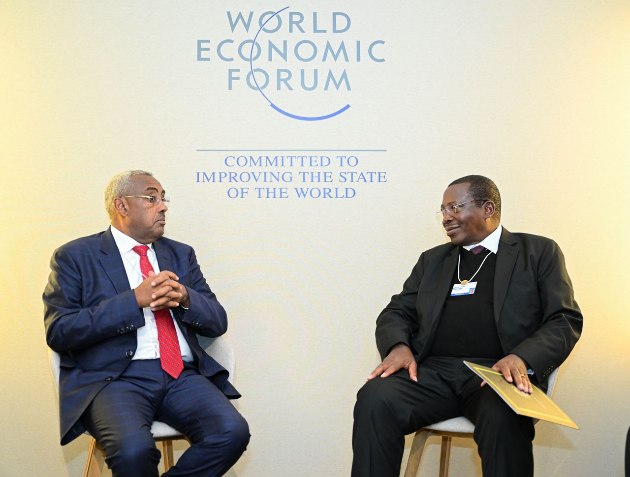 Makamu wa Rais wa Jamhuri ya Muungano wa TanzaniaMhe. Dkt. Philip Isdor Mpango akifanya na Naibu Waziri Mkuu na Waziri wa mambo ya Nje wa Ethiopia Mhe. Demeke Mekonnen Hassen pembezoni mwa mkutano wa WEF.